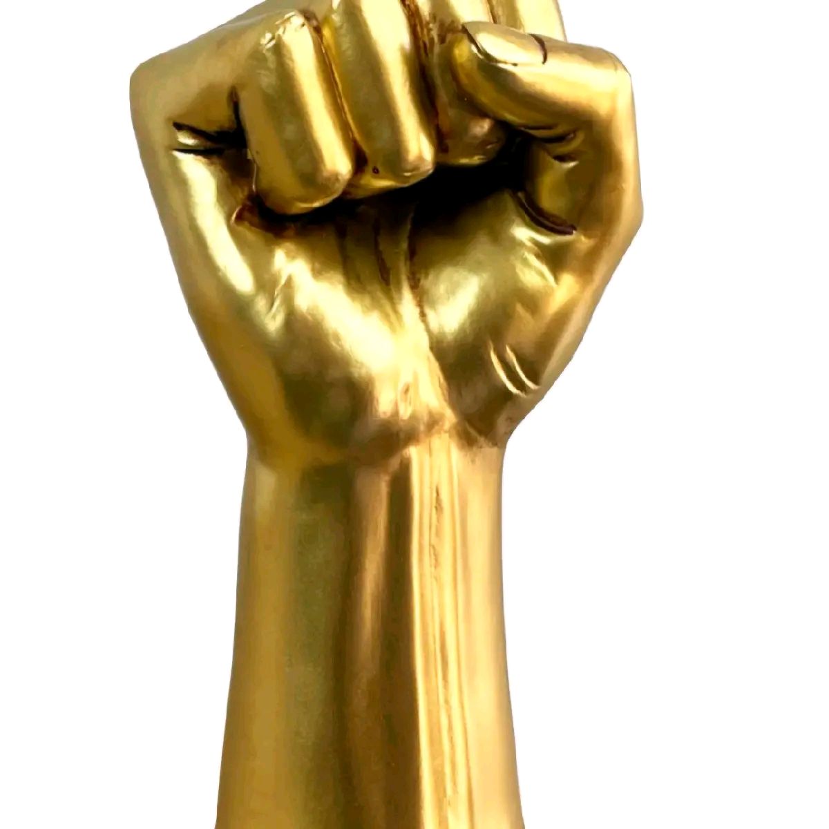 Introducing our contemporary abstract ornament for the home, a power fist hand sculpture made from resin with a gold coloured finish. This minimalist design is perfect for contemporary, Scandinavian, and Nordic themed interiors. The ornament is suitable for display and decoration around the home on windowsills, mantlepieces, and console tables in living rooms, bedrooms, and hallways.