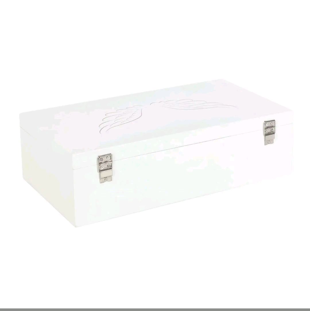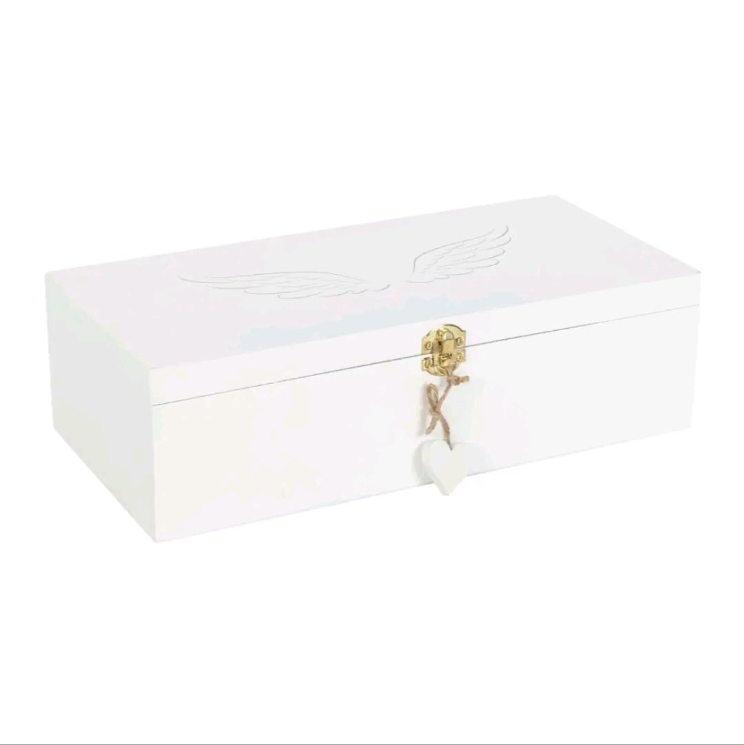 Keep cherished memories of loved ones safe for years to come with this simple and elegant memory box. Printed with a delicate angel wing design and finished with a charm on the latch, this special box makes a thoughtful gift for those in need of some extra comfort and care