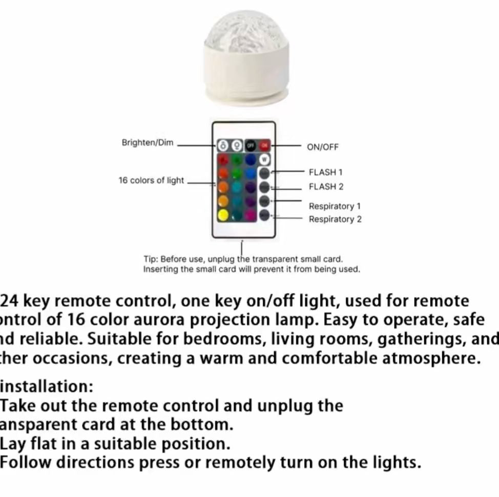 Introducing the Aurora/Water Ripple Light, a unique and mesmerizing addition to any room decor. This LED lamp is designed to create a stunning Northern Lights Ambient Light effect, providing a calming and relaxing atmosphere to any space. With 16 different colors to choose from, you can easily customize the lighting to match your mood or decor style.