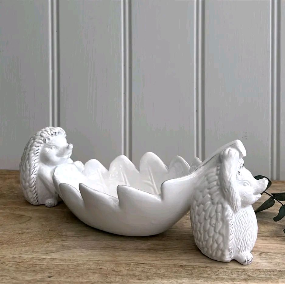 A crisp and clean white ceramic decorative dish, featuring a pair of cute hedgehogs carrying a leaf. Glossy white finish with very slight markings/distressing on leading edges for a stylish, slightly vintage feel.