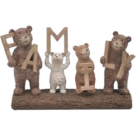 A collection of bears holding 'family' letters whilst stood on a rock.