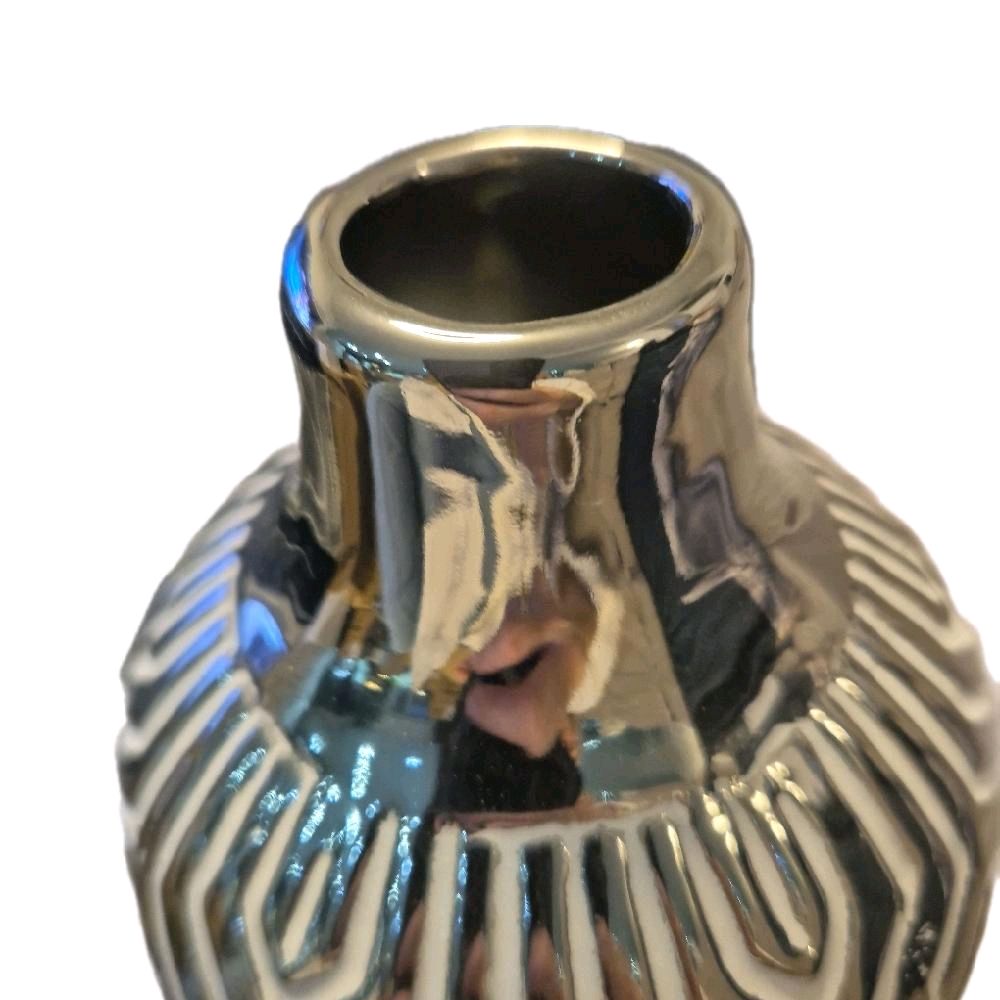 Introducing the HESTIA® Luxe Living vase, a stylish and modern addition to any home decor. This vase is made of durable ceramic material and stands at a height of 24.5cm. The vase has a textured silver mirror and white finish, which adds a unique and eye-catching design element to the vase. The contemporary geometric pattern on the vase adds a modern and stylish touch to the vase, making it a perfect addition to any contemporary home decor.