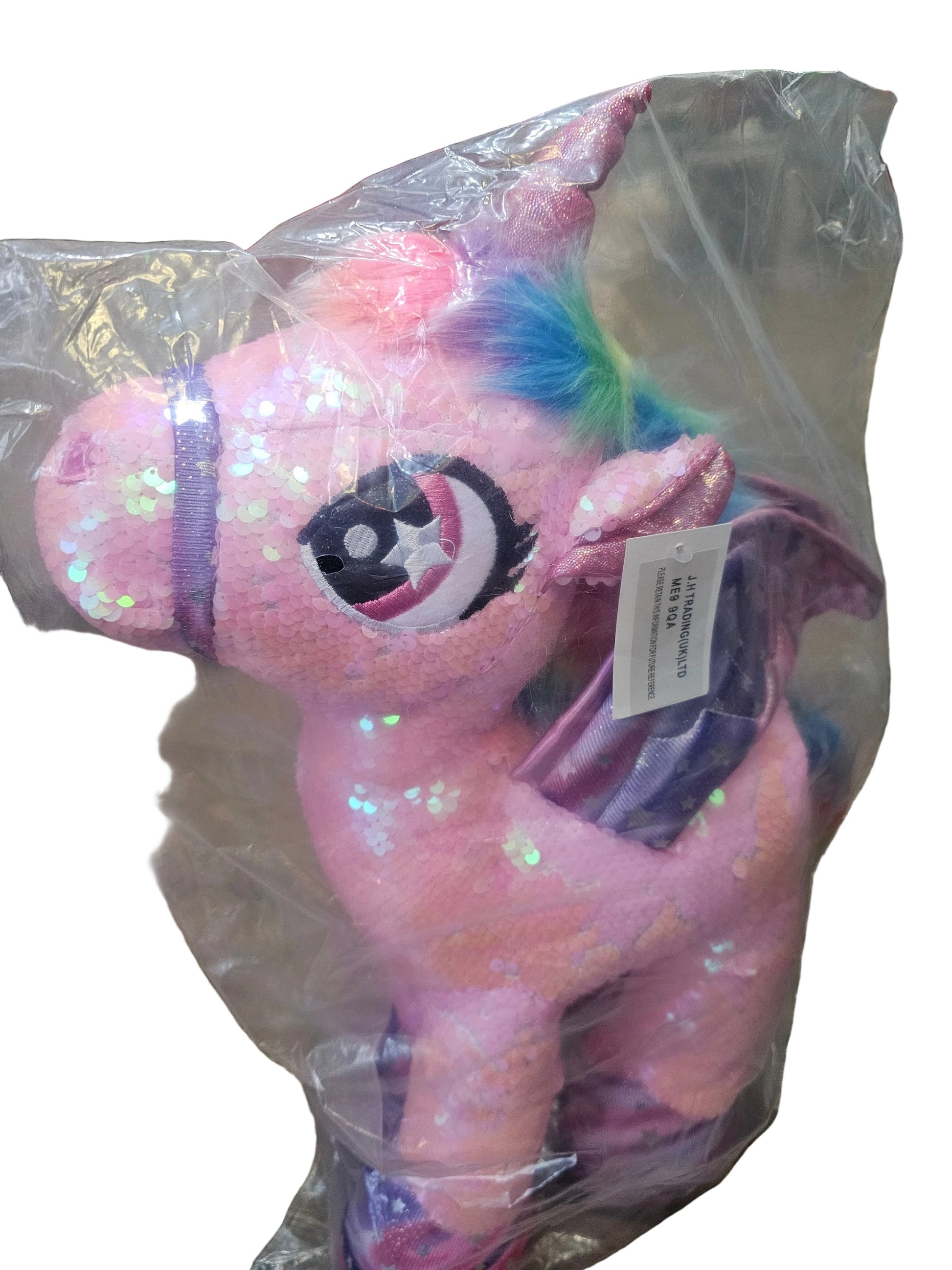 Features a sparkly pink body, rainbow wings, and a horn.