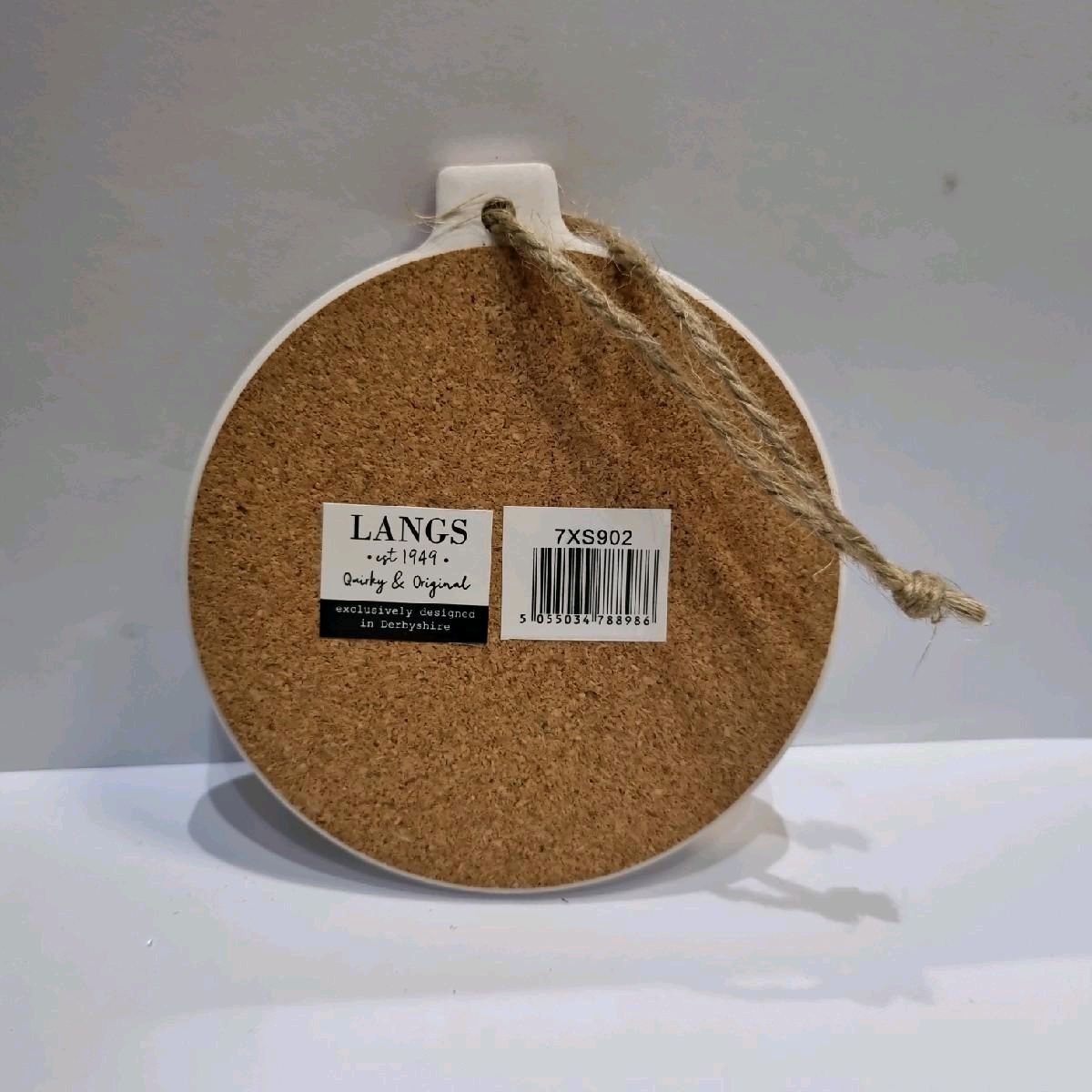 The bauble features a ceramic front and a cork back. It's designed to hang