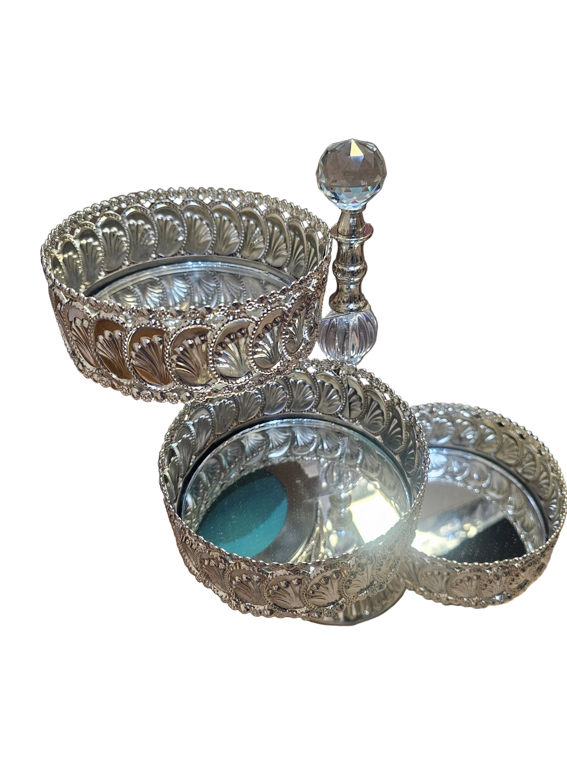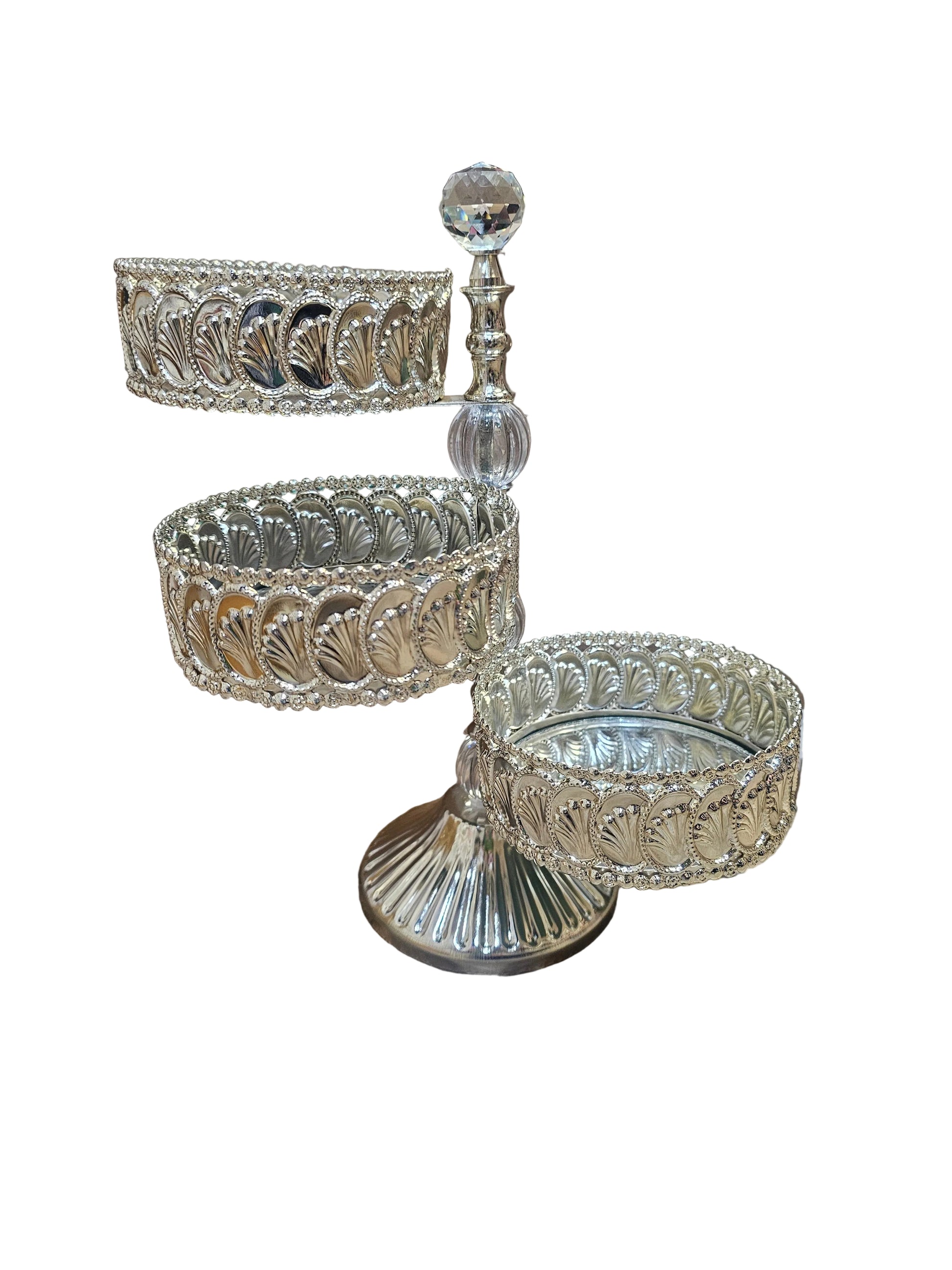 Silver-plated tiered metal cake or candy stand with a mirror top and shell detailing