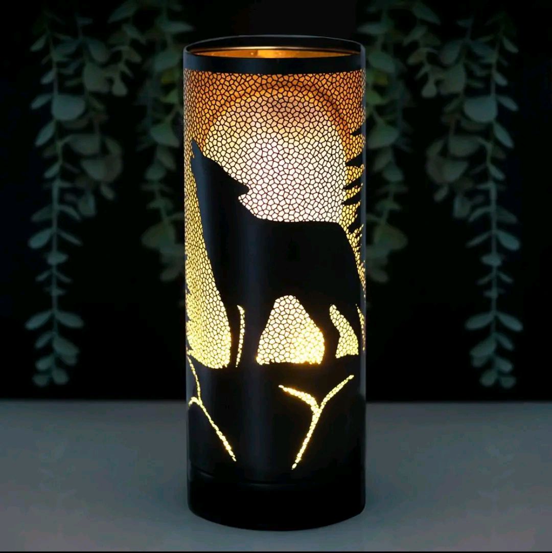 Lisa Parker's stunning 'Wolf Song' artwork creates the perfect focal point for this aroma lamp. A black silhouette of a howling wolf and moon overlays an orange background that is illuminated from behind. Use with fragrance oil or wax melts to gently fragrance the home.